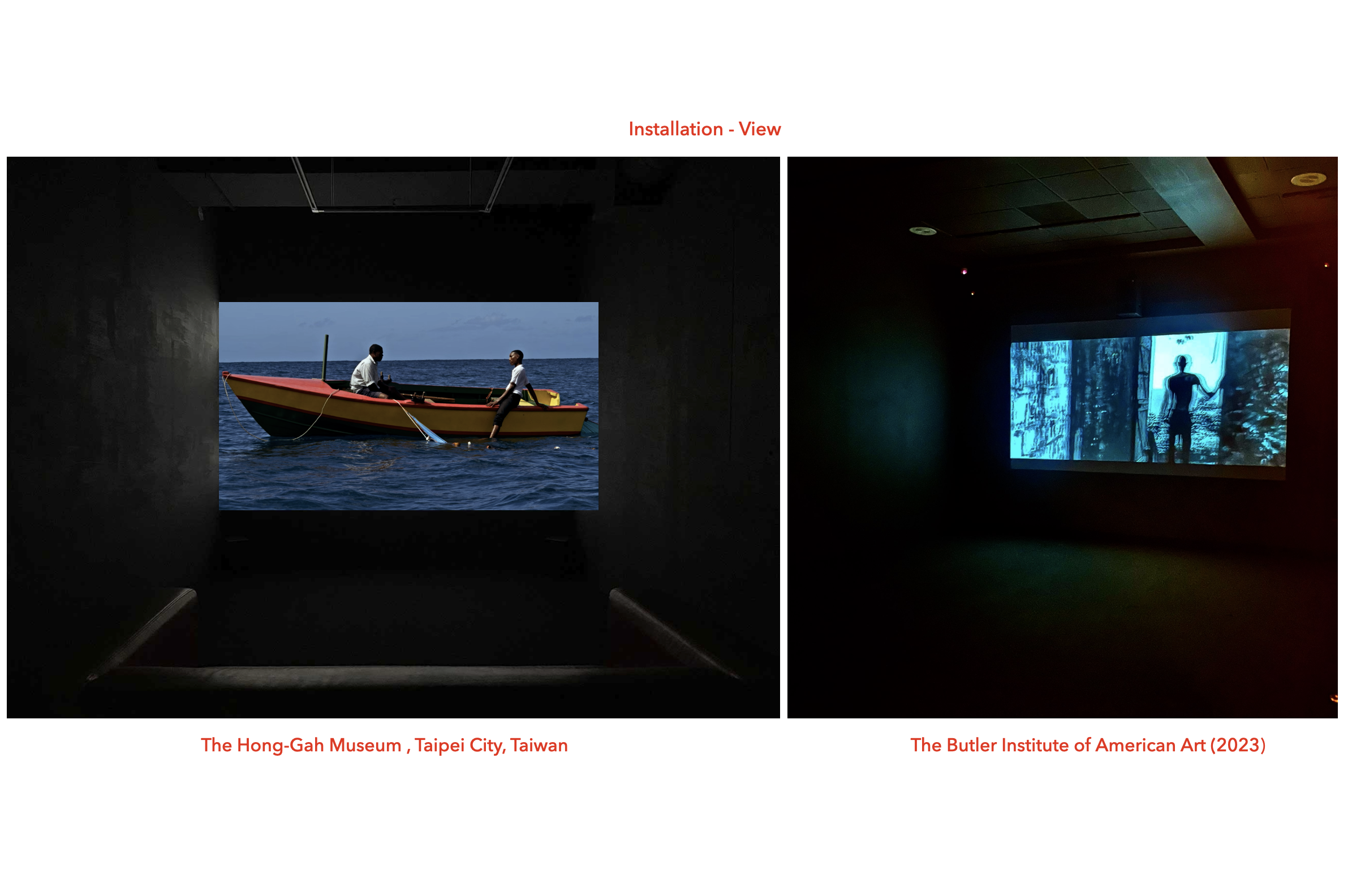 The accompanying collages of Second Eulogy: Mind The Gap serve as an extension of the film installation. Images from my father’s suitcase and other sources touch on motifs from the film to re-contextualize the personal, historical, and psychological impact that Grenada and my father have played in my life. Many of the images are hand-sewn into the canvas as acts of remembrance to my father who was a skilled and sought-after boat builder. He too hand hand-stitched his canvases, and the sails of his countless hand-made boats. In addition, images of the Empire Windrush add historical context to my father and several other family members who came of age during the great migrations of West Indians to England and America. Some of the texts on the canvas are fragments taken from letters I found in my father’s suitcase. The usage of text and photography played a primordial role in the formation of this collection.